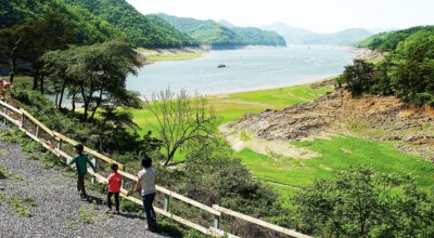 옥순봉 생태공원은 생기 넘치는 자연을 마주할 수 있는 곳이랍니다. 입구에는 편백나무 숲 체험과 연관된 시설이 있답니다. 생태공원 뒤로 수산 면산이 보이예요. 잔잔한 물이 흐르는 작은 강에는 검은 잠자리가 가득해요. 강을 건너면 곡궁 체험관이 나옵니다. 저렴한 가격으로 양궁을 체험할 수 있어 인기가 많다고 해요. 사람의 손길이 닿지 않은 울창한 팜파스 초원을 따라 걸으면 마치 늪지대를 탐험하는 기분을 느낄 수 있어요.