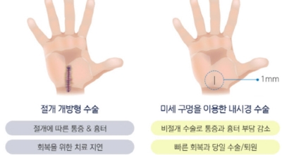 수근관 증후군의 가장 효과가 좋은 치료는 바로 수근관을 넓혀주는 수술이예요. 수술적 치료는 근본적으로 횡 수근 인대를 잘라내어 수근관을 넓혀주는 것으로, 수근관 유리 술이라 불려지는데요. 피부 절개를 어떻게 하는지에 따라 개방성과 관절 경적 방법으로 나누어지며 환자상태를 정확하게 확인한 다음 어떤 가짓수 위 수술을 할 것 인가를 결정하게 됩니다. 수근관 유리 수술 시에 까닭을 제거하는 수술을 함께 시행해야 됩니다.